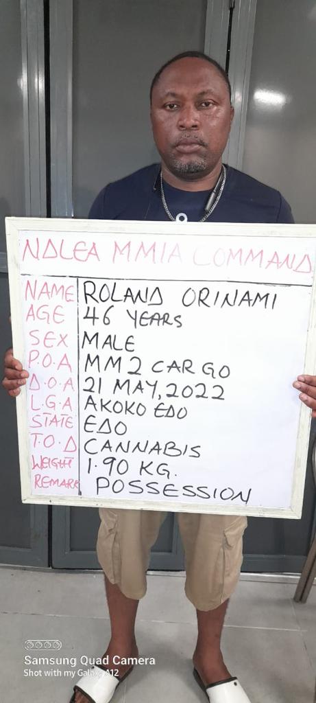 Thefollowing day, Saturday 21st May, a freight agent, Roland Orinami was arrested by NDLEA operatives attached to the local wing of the Lagos airport with1.90kg Loud, a variant of cannabis, factory packed in some bottles while trying to send same via flight to Abuja.
