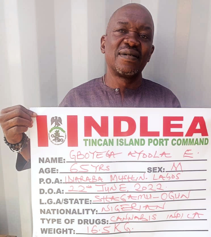 One of them, Gboyega Ayoola Elegbeji was arrested at his house, 14 Bakare Street, Idi Araba, Lagos on Wednesday 22nd June, for importing a 40ft container TRHU7874497 containing 33 parcels of cannabis indica (Colorado) weighing16.5kg.