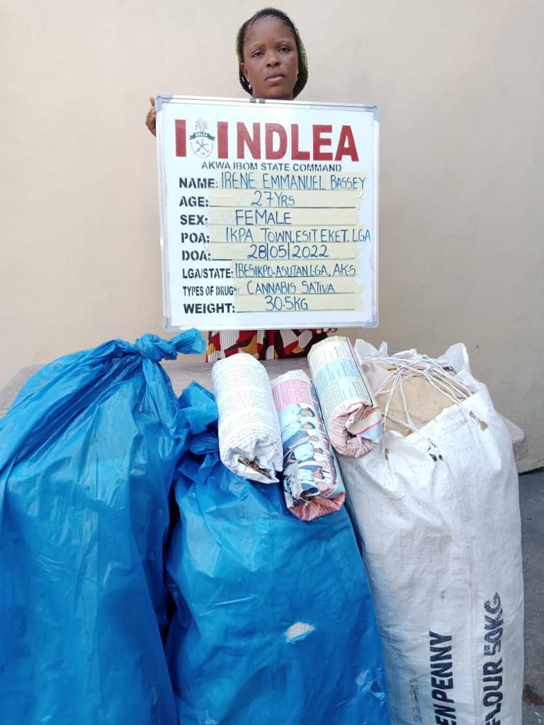 In Akwa Ibom, a female drug dealer, Irene Emmanuel Bassey was arrested on Saturday 28th May, during a search of her house at Ikpa town, Esit Eket LGA where 30.5kg cannabis was recovered, while one Muideen Rasaki was nabbed with 90.8kg cannabis at Elere, Boluwaji area of Ibadan South-East LGA.